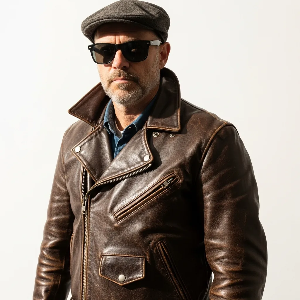 A rugged, old school motorcycle jacket with a worn in look and a comfortable fit.